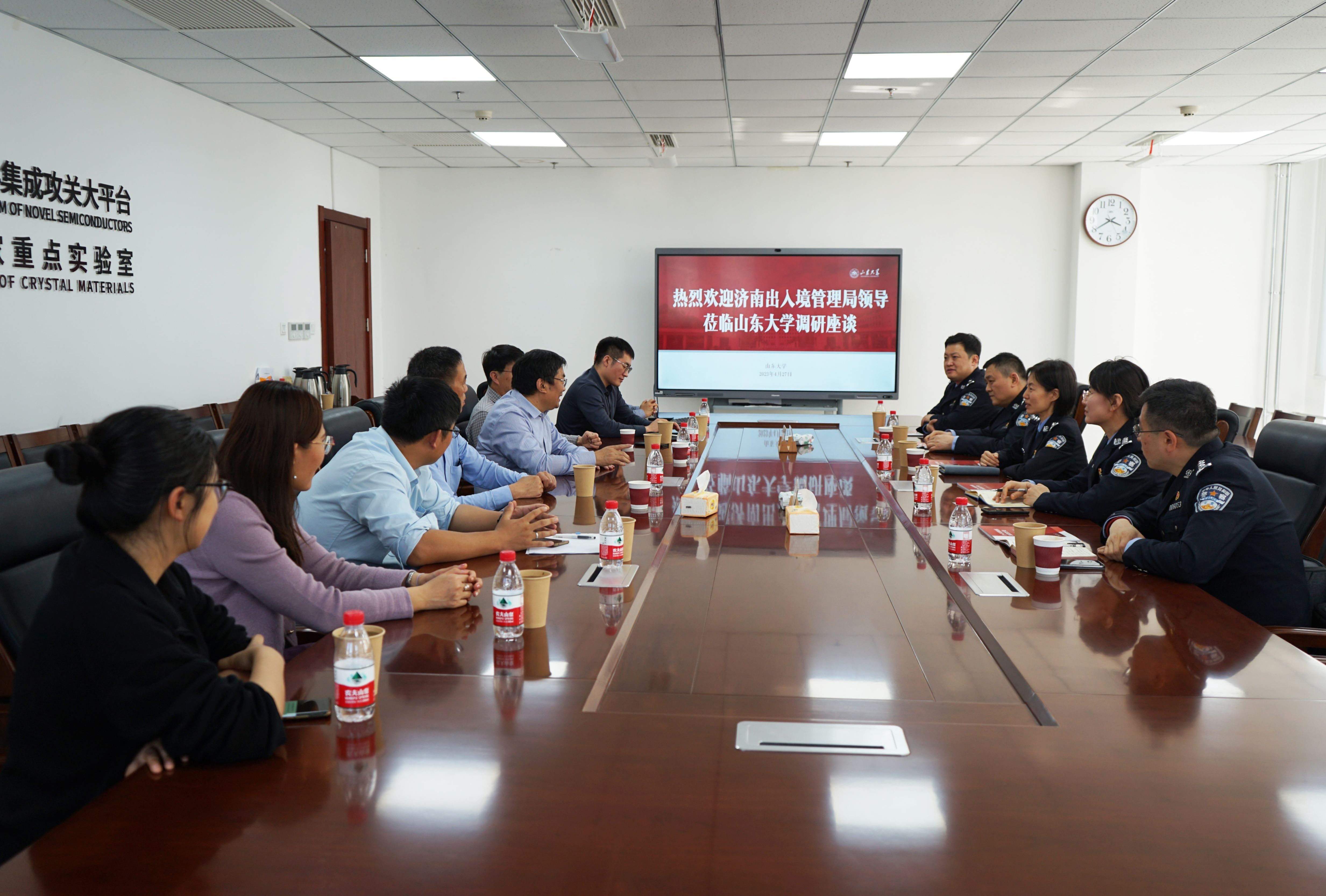 4月27日,济南市公安局出入境管理局领导专家一行来访新一代半导体材料集成攻关大平台,大平台主任徐现刚、副主任王焕杨作相关讲解。集成攻关大平台特聘教授韩吉胜、特聘教授Handoko LINE...