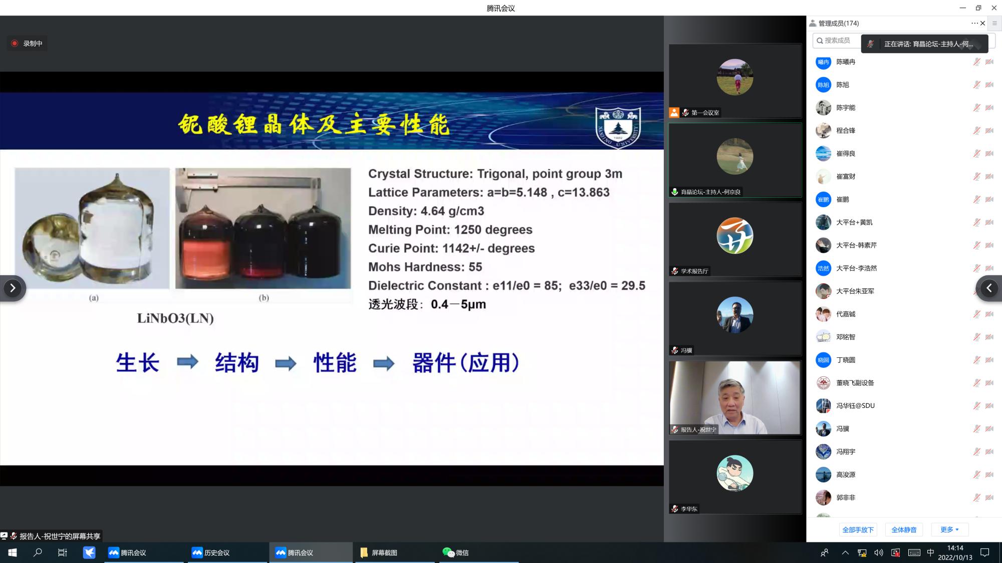 祝世宁院士作了题为《老材料,新机遇:铌酸锂晶体及其应用》的学术报告。铌酸锂晶体是一种有着悠久研究历史的铁电晶体,具有优异的电光、声光和非线性光学性能,在当代信息技术,特别5G/6G通信中有着重要应用。报告从铌酸锂晶体的基础知识讲起,回顾了铌酸锂晶体及其器件的研究历史介绍薄膜铌酸锂(TFLN)制造、微纳加工及集成化方面的最新进展,也对薄膜铌酸锂在未来集成光电子、光量子技术中的地位、作用和挑战进行了分析。报告最后,祝院士分享了蒋民华先生的《晶体赋》,希望大家学习蒋民华先生一生致力于晶体研究的科学家精神,为我国晶体材料学科发展做出更大贡献,并祝愿“育晶论坛”系列活动圆满成功。