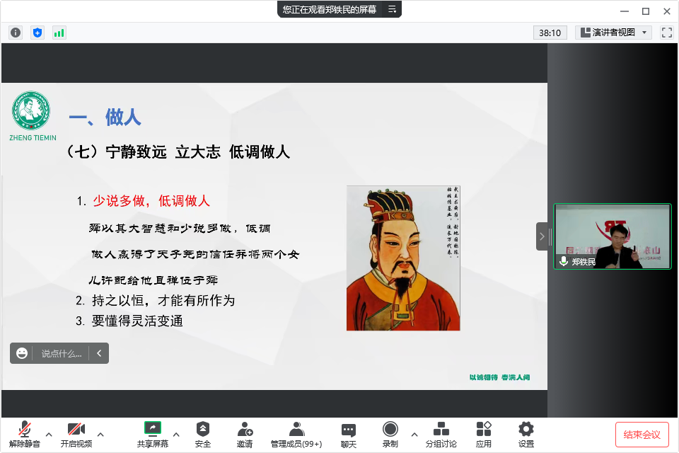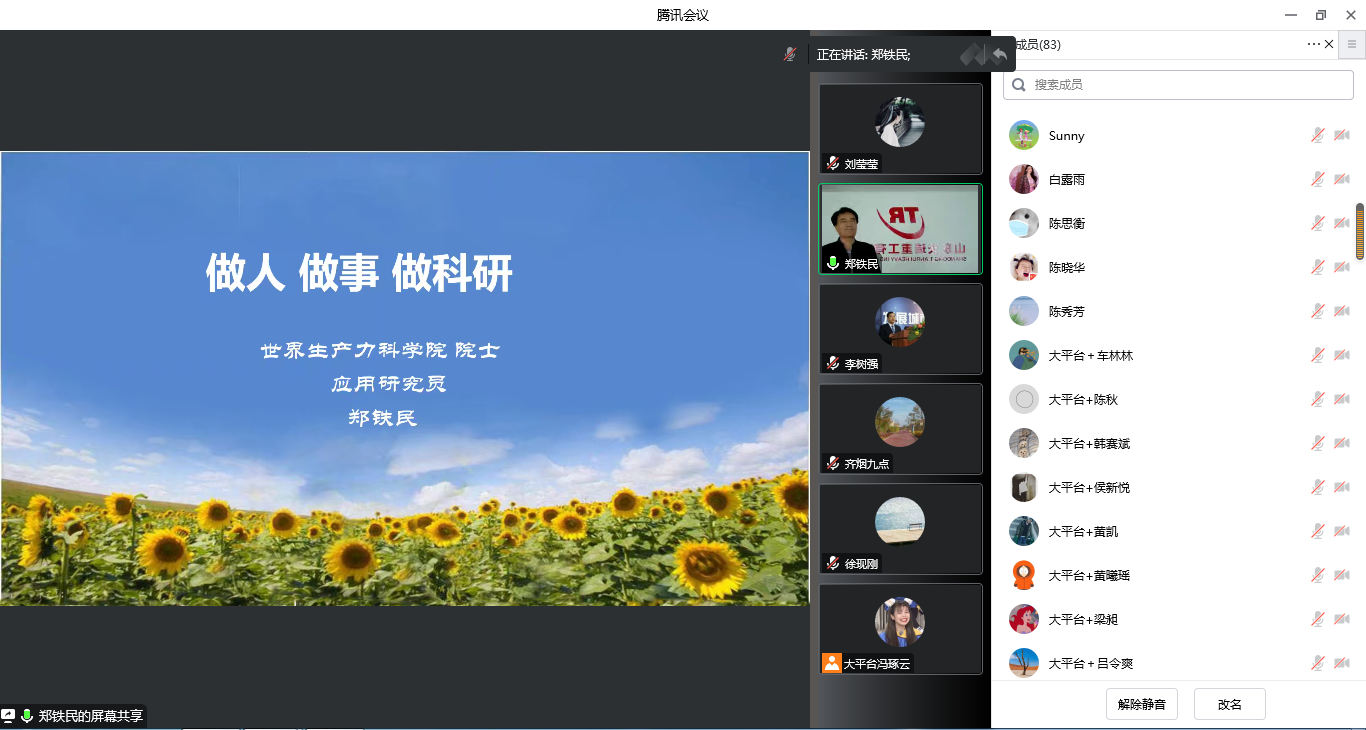 郑铁民先生由中华优秀传统文化讲起,娓娓道来关于做人、做事、做科研的道理与方法论。他结合自身亲身经历,劝诫大家学习圣人的做人、处事及言行之道,鼓励大家做德才兼备、志向远大、内省感恩的人;郑铁民先生介绍了多位杰出人物的实例,启发大家学习他们能屈能伸、敢想敢做、唯才是举等可贵品质;他结合“5W2H分析方法”,分享了做好科研的路径与标准;报告最后,郑铁民先生介绍了其所在的多家企业与北京大学、山东大学等高校开展政产学研合作的典型实例,分析了理论成果与生产实践紧密结合,将科研成果转化为生产力的过程和关键点。