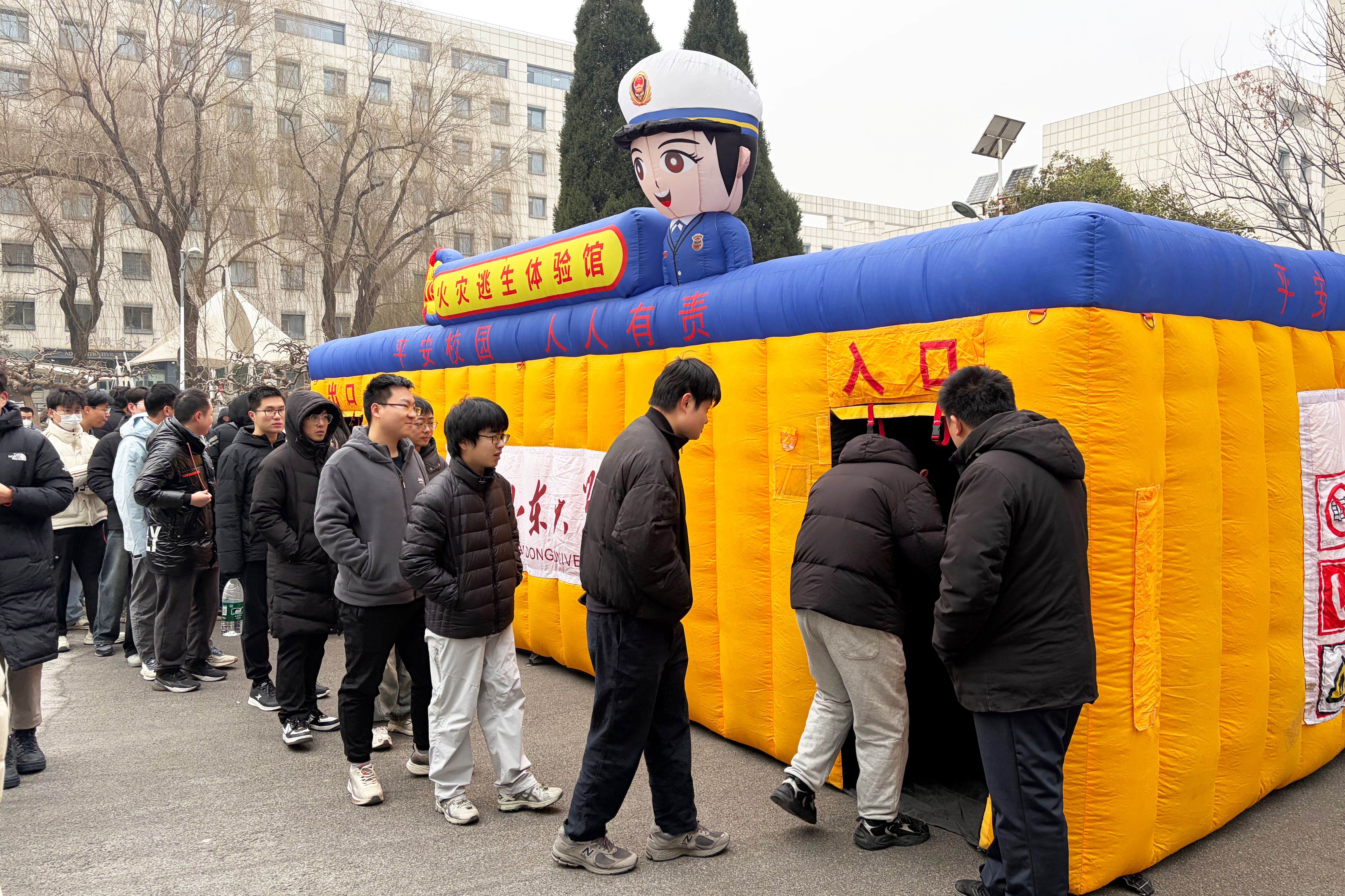 消防演练环节中,孙会全、韩知乐现场演示消防逃生流程,讲解灭火器使用规范与突发火情注意事项。师生依次进入火灾逃生体验馆,在模拟的黑暗、浓烟环境中,亲身实践低姿行进、沿墙疏散、捂鼻前进等逃生技能。在室外灭火实操区,参训人员分组操作灭火器扑救模拟火点,掌握初期火灾应对方法。