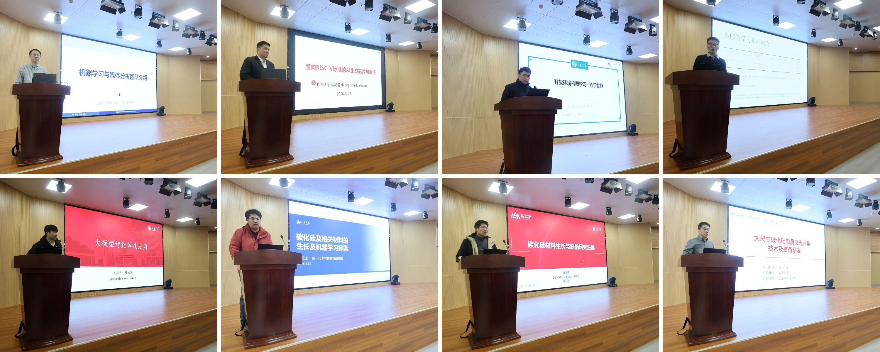 座谈会后,“SDU TALK”学科交叉青年论坛举行。软件学院许信顺教授、戴鸿君教授、韩忠义教授、吴国强副教授、杜云涛副研究员,集成攻关大平台郁万成教授、谢雪健教授、王荣堃副研究员分别围绕“机器学习与媒体分析”“面向RISC-V标准的AI生成芯片与系统”“开放环境机器学习+科学智能”“强化学习算法与大模型理论初探”“大模型智能体及应用”“碳化硅及相关材料的生长及机器学习探索”“碳化硅材料生长与缺陷研究进展”“大尺寸碳化硅单晶激光剥离技术及装备研发”分享了前沿成果。与会师生围绕学科交叉领域热点展开深入研讨,为后续开展实质性科研合作奠定了良好基础。