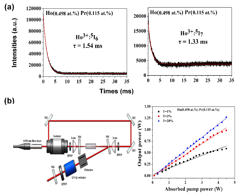 图3 (a)Ho,Pr,YLF晶体上下能级荧光寿命;(b)1150 nm光纤激光器双端泵浦Ho,Pr,LLF中红外激光器结构及输出功率曲线