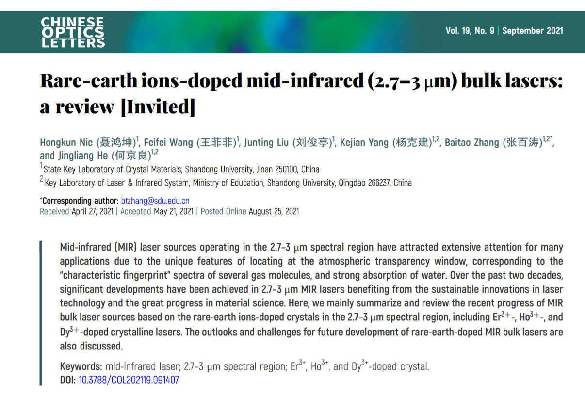 近日,张百涛、何京良教授课题组综述了基于Er3+、Ho3+和Dy3+离子掺杂晶体的2.7-3μm波段中红外固体激光的研究现状,系统地介绍了稀土离子掺杂晶体中红外固体激光的关键技术和研究进展,并对现存挑战和未来发展作了简要评述。相关内容发表在Chinese Optics Letters第19卷第9期。