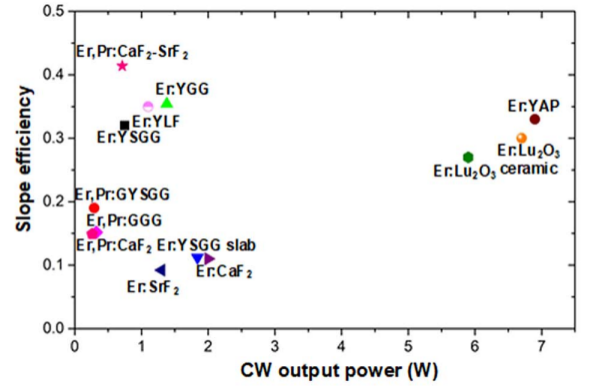 Er3+离子掺杂激光晶体是目前研究最广泛的中红外固体激光增益介质。Er3+离子4I11/2→4I13/2能级跃迁存在上能级(4I11/2)寿命小于下能级(4I13/2)寿命所引起的激光“自终止”效应,通过高掺杂提高Er3+离子间能量传递效率进而提高4I13/2+4I13/2→4I9/2+4I15/2能量上转换过程或者通过共掺去激活离子(Pr3+等),可有效降低下能级4I13/2的寿命、实现下能级去激活。图2给出了目前端面泵浦Er3+离子掺杂中红外固体激光器输出功率和斜效率,室温下最高输出功率为6.9 W(5 at%,b-cut Er:YAP),最大斜效率为41%(5 at%,Er,Pr:SrF2-CaF2)。闪光灯侧面泵浦结构是常用的获得大能量2.7 μm中红外激光的主要技术手段,结合LGS电光调Q技术实现了216 mJ大能量、窄脉宽(14.36 ns)中红外激光输出。同时,利用半导体可饱和吸收镜(SESAM)、Fe:ZnSe和新型的二维材料作为可饱和吸收体也实现了Er3+掺杂激光晶体中红外波段被动调Q激光输出。