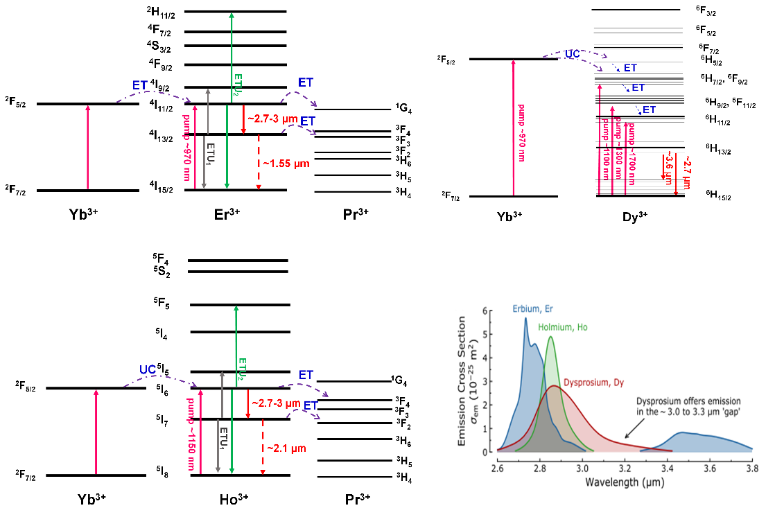图1 Er3+、Ho3+、Dy3+离子中红外波段跃迁能级简图、发射谱