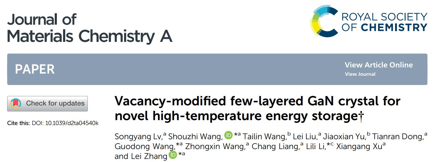氮化物任务组,实现了GaN晶体储能器件在150℃高温环境下稳定工作。研究成果以“Vacancy-Modified Few-Layered GaN Crystal for Novel High-Temperature Energy Storage”为题,发表在国际期刊Journal of Materials Chemistry A (IF:14.51)上。博士生吕松阳为第一作者,王守志、王国栋、张雷为共同通讯作者,山东大学为第一通讯单位。