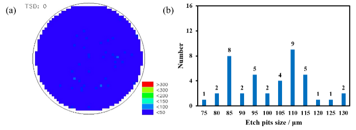 山东大学与南砂晶圆于2022年实现了低微管密度高结晶质量的8英寸导电型4H-SiC单晶和衬底的制备,近期在8英寸SiC衬底位错缺陷控制方面取得了重大突破,实现了近“零TSD”和低BPD密度的8英寸导电型4H-SiC单晶衬底制备。图1(a)所示为制备的8英寸导电型4H-SiC单晶衬底,使用熔融KOH对衬底进行选择性蚀刻,统计BPD和TSD对应的特征腐蚀坑数量,计算BPD和TSD密度。图1(b)为衬底的BPD密度分布图,平均BPD密度为202 cm-2。图2(a)给出了TSD密度分布图,平均TSD密度<1 cm-2。图2(b)为不同尺寸TSD腐蚀坑对应的数量,其中TSD数量总计42个,测试点数1564个,每个点对应面0.0489cm2,因此TSD密度=42 / (1564×0.0489cm2)=0.55 cm-2。