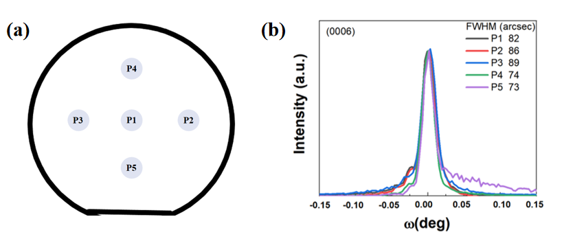 图2:(a) 2英寸α-Ga2O3外延膜点位分布图(p1-p5); (b) p1-p5点位α-Ga2O3(0006)晶面摇摆曲线。