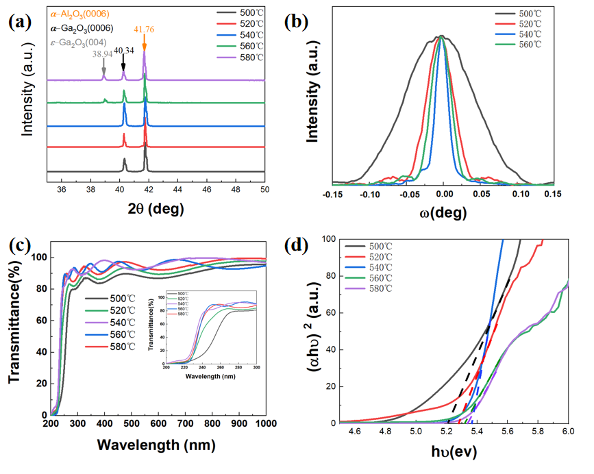 图1:(a)蓝宝石衬底位置z=50mm,生长温度500-580℃下制备的α-Ga2O3外延膜的粉末XRD谱图、(b) (0006)晶面摇摆曲线、(c)透过光谱、(d)光学带隙。