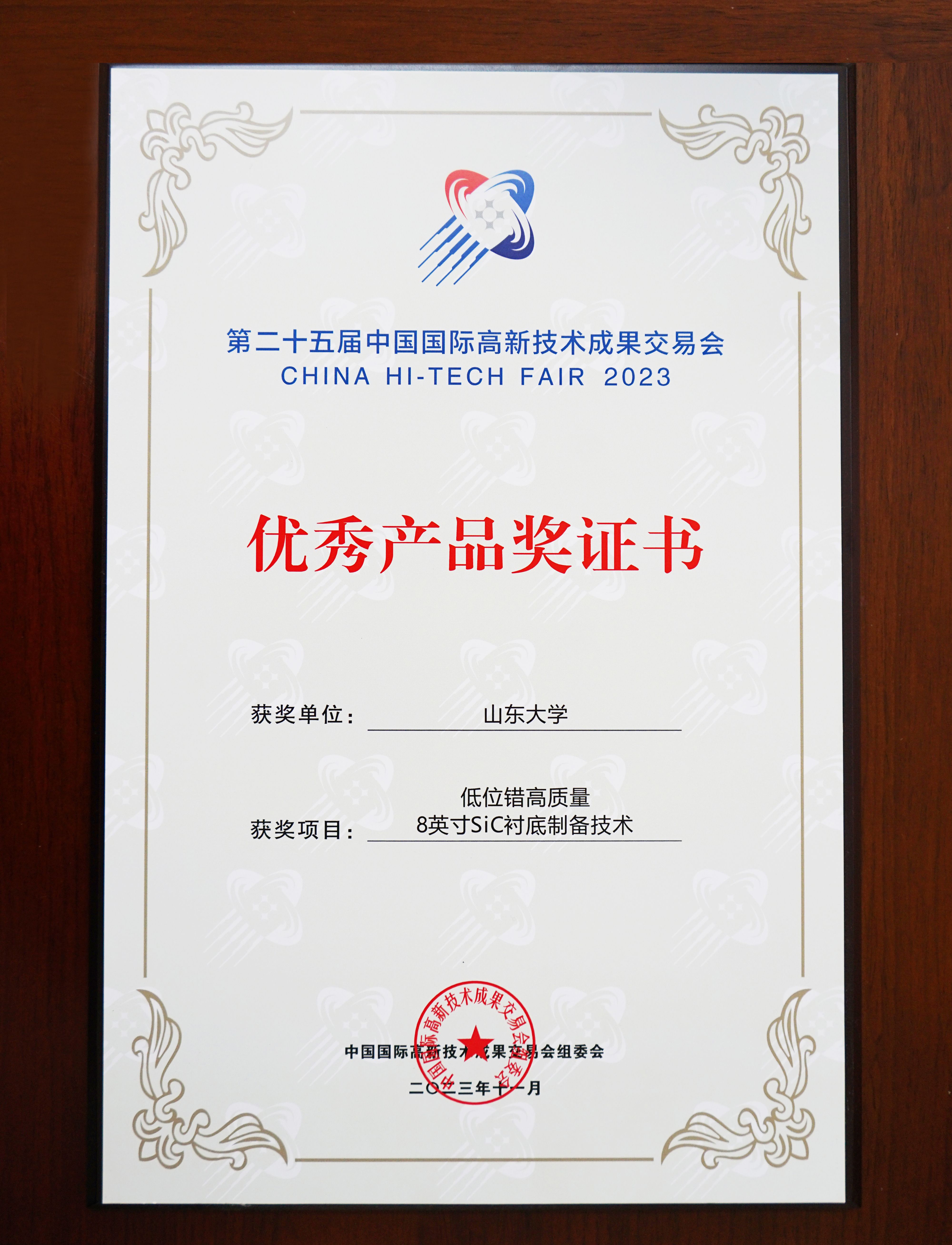 11月15日至19日,第二十五届中国国际高新技术成果交易会在深圳举办,会议以“激发创新活力提升发展质量”为主题,重点围绕“十四五”规划布局和科技发展重点领域,集聚创新要素,展示海内外最前端科研技术及产品,持续推进产学研深度融合,为推动实现高水平科技自立自强作出新的贡献。山东大学参加科技成果展示和成果交易洽谈活动,并获得“优秀组织奖”和“优秀展示奖”;新一代半导体材料集成攻关大平台碳化硅团队“低错位高质量8英寸SiC衬底制备技术”荣获组委会颁发的“优秀产品奖”。