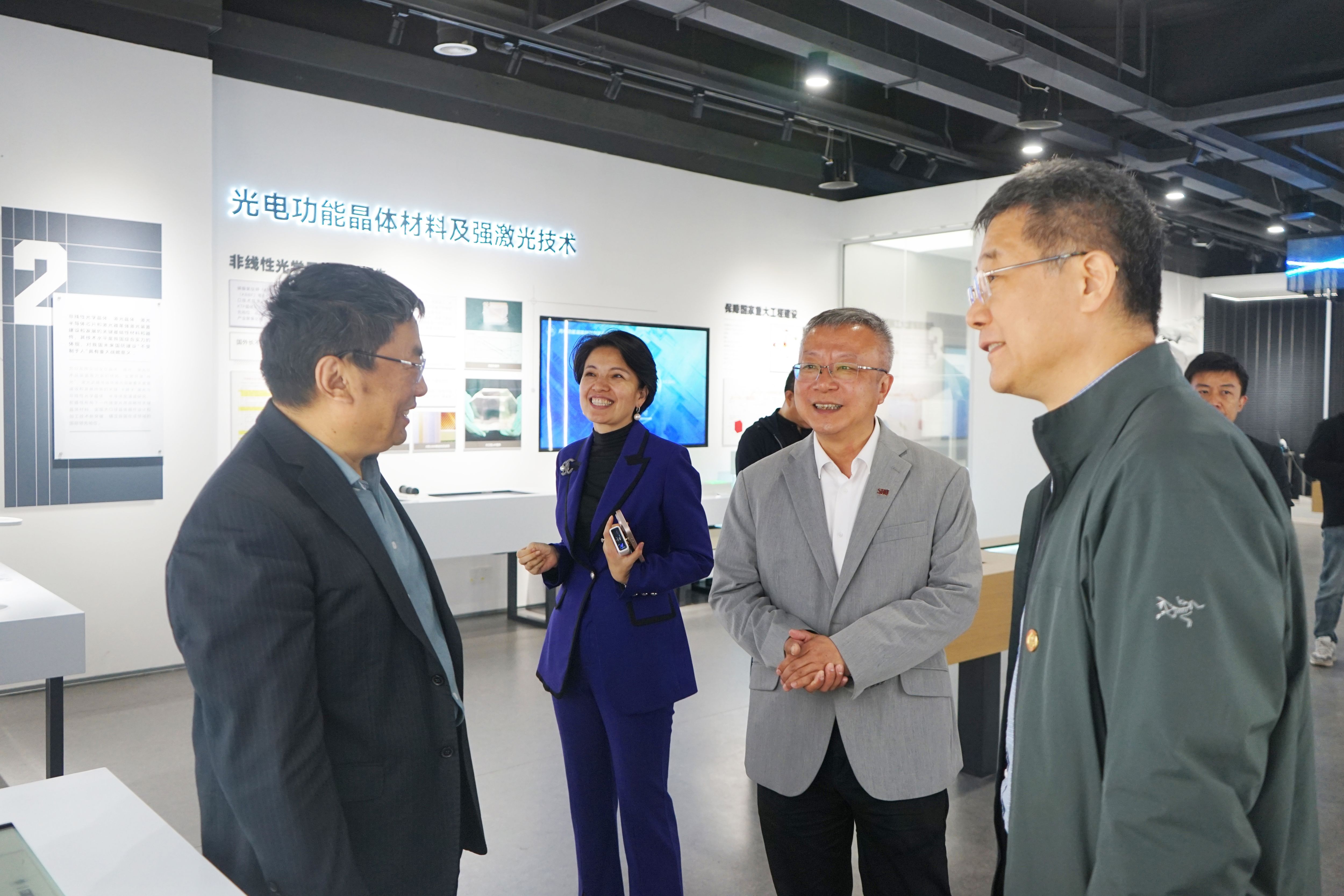 4月11日上午,全国政协常委、民进中央副主席张雨东,北京苏州企业商会一行到访新一代半导体材料集成攻关大平台调研参观。山东大学党委书记任友群、党委副书记陈宏伟,晶体材料全国重点实验室党委书记、集成攻关大平台党总支书记刘全芬陪同调研;晶体材料全国重点实验室主任、集成攻关大平台主任徐现刚接待来访。张雨东来到晶体材料生长实验室实地调研,听取了徐现刚对平台主要研究方向、重大研究成果及在技术转化和产业化方面的详细汇报。