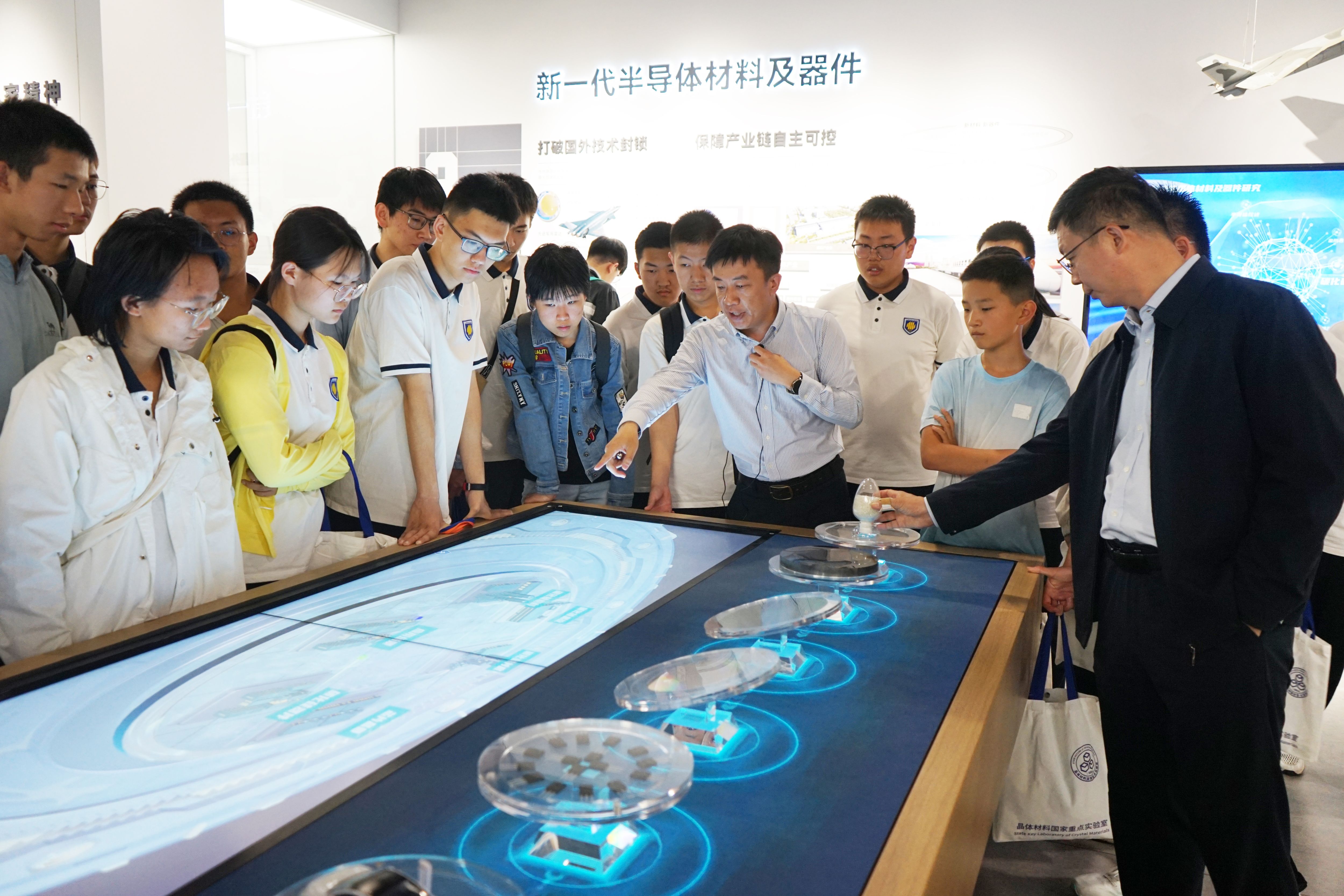 5月25日下午,晶体材料全国重点实验室面向中学生举办“探索晶体奥秘·启迪科学梦想”主题开放日活动,山东师范大学附属中学近百名中学生到新一代半导体材料集成攻关大平台参观调研,晶体材料全国重点实验室主任、集成攻关大平台主任徐现刚接待来访,大平台副主任任颖作相关讲解。山东师范大学附属中学副校长李成金表示,希望参加活动的同学能够珍惜此次近距离接触科研一线的机会,在探寻科学奥秘的同时,感悟科学家心怀“国之大者”的奉献精神,并以此为契机,树立远大理想,努力奋发成才。