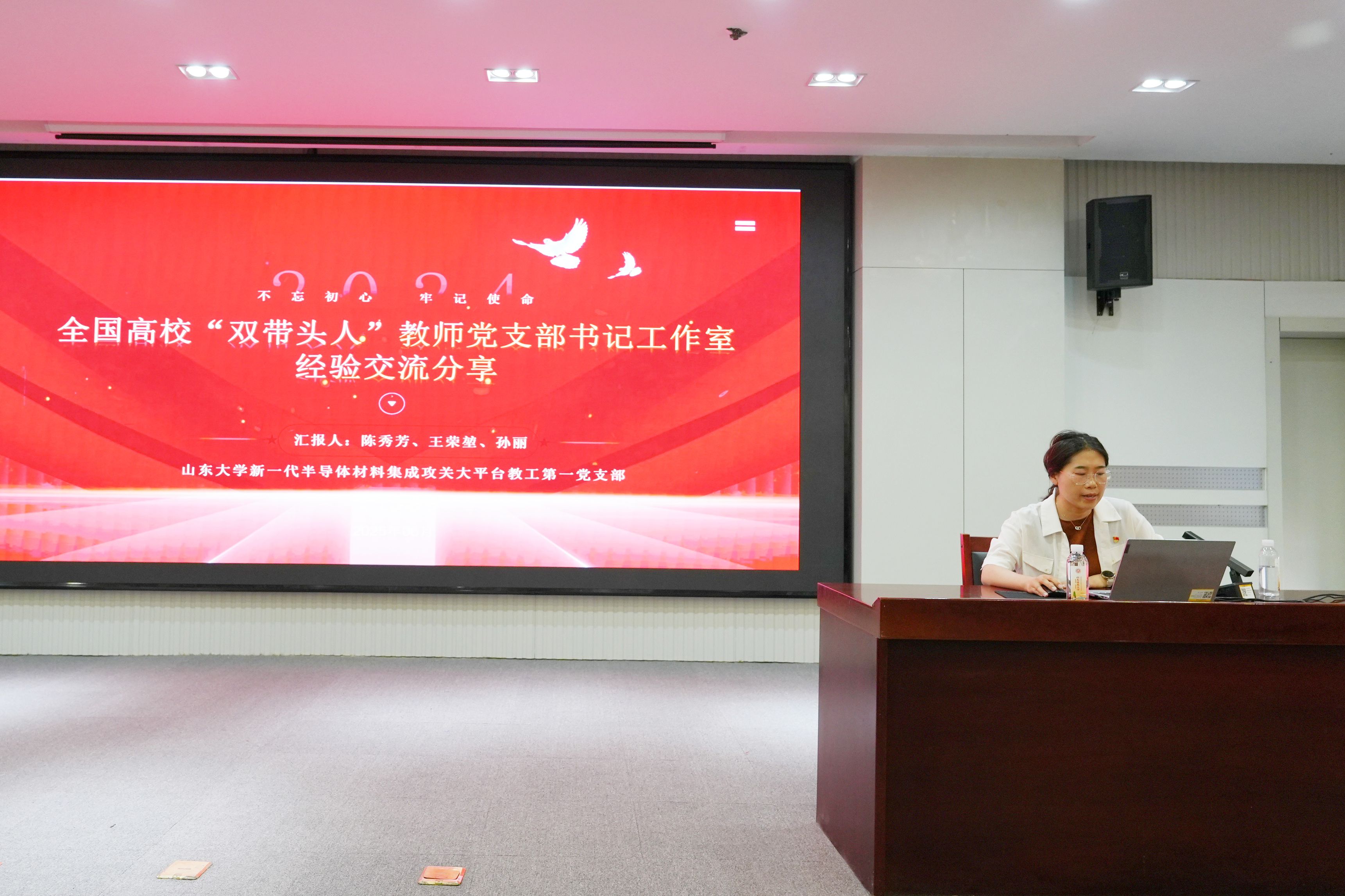 新一代半导体材料集成攻关大平台教工第一党支部党员孙丽代表支部,分享了全国高校“双带头人”教师党支部书记工作室的建设及申报经验。第一党支部在团队带头人徐现刚教授和支部书记陈秀芳教授的带领下,以重大科研任务为纽带,切实将组织生活嵌入科研攻关链条。陈秀芳书记始终坚持“业务做到哪里,党的工作就延伸到哪里”的原则,在中试基地创新性地建立了“先锋攻关团队临时党支部”,充分激发了支部党员在碳化硅衬底及器件领域“卡脖子”技术攻关过程中的先锋模范作用。通过分享第一党支部党建引领科研攻关的典型案例,以及对全国高校“双带头人”教师党支部工作室申报书的深入解析,力求为省内高校提供可复制、可推广的组织范式。